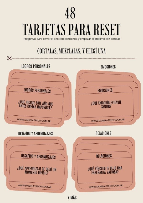 Cada tarjeta contiene una pregunta cuidadosamente creada para invitarte a mirar hacia adentro, redefinir tus prioridades y hacer un “reset” emocional y mental cuando más lo necesites.
